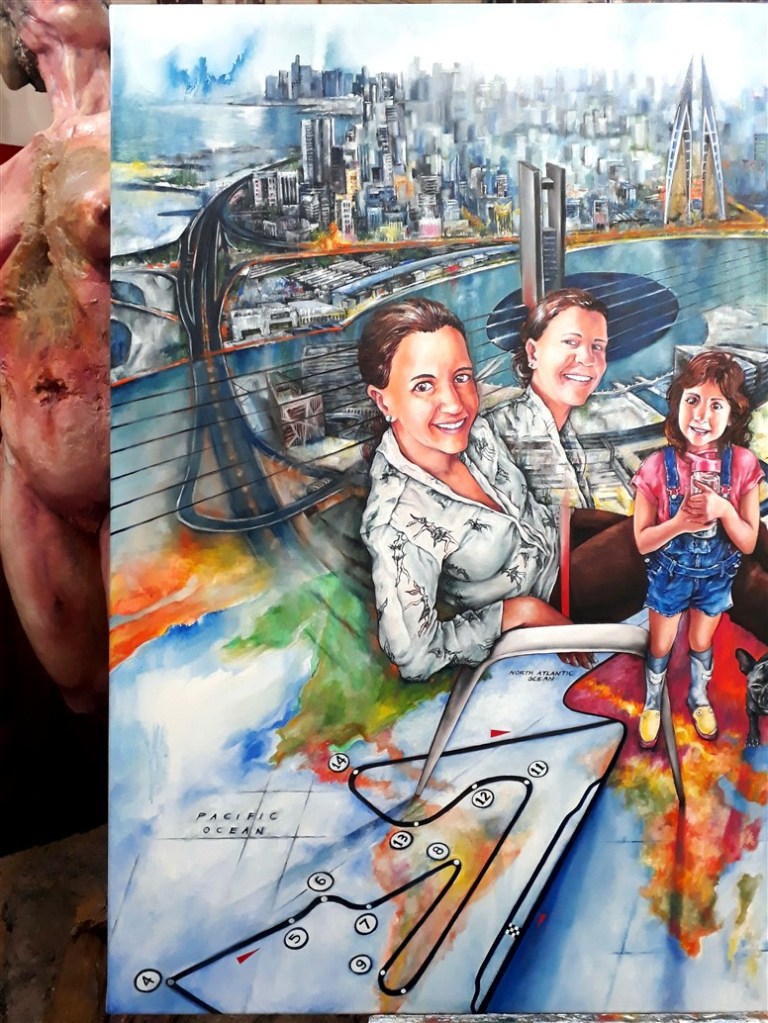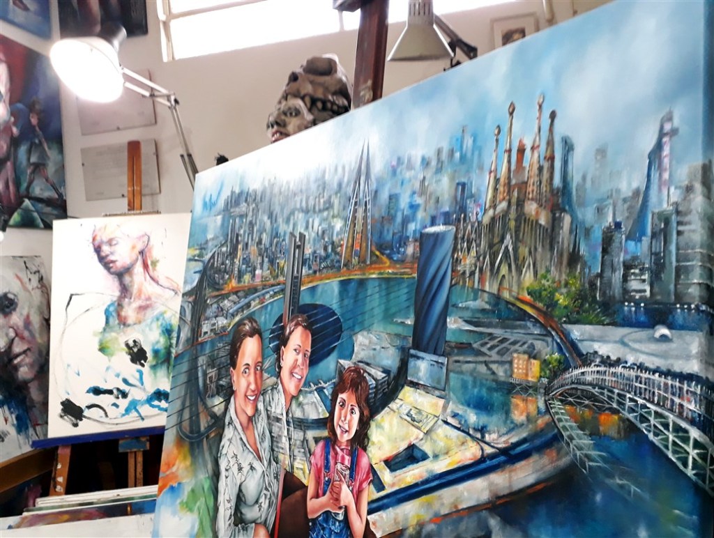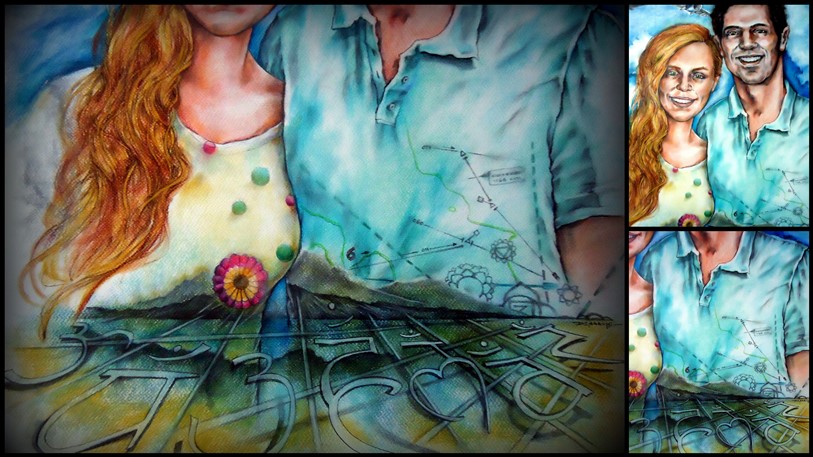 1- Working on Sami & son’s portraits. Oil on canvas. W.I.P pics // 2 – Family portrait for Patrick, pets included as well as references to their lives, interests & places meaningful for them. Oil on canvas. Such an amazing commission to paint! // 3 – A couple of Cellebrities’ portraits. Acrylic on canvas. // 4- Mato & Lau’s Anniversary: 6 years of engagement. Oil on board. // 5 – Soft pastel portraits on paper; double portrait as a wedding gift, 2 separates fiancee portraits, Rollin’s portrait w/frogs. // 6 – 2 lil siblings portraits. Oil on canvas. // 7 – Eva’s portrait w/ her creations. Watercolor. // 8 – Digital portraits for a wedding invitation card. // 9- Graphite pencil portraits on paper.