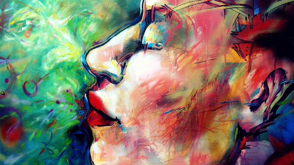 ‘Bacio / Love is inthe Air’ (Beso / El Amor está en el Aire) Nueva pintura, comenzada y terminada en un día, basada en la ilustración digital hecha para unas poesías de Antonio Nazzaro. Técnica mixtísima s/tela. Año 2015.