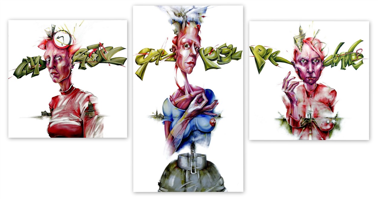 Private Collection. ‘Moon… that Goes… Through Where? Tríptico. Oil on canvas.