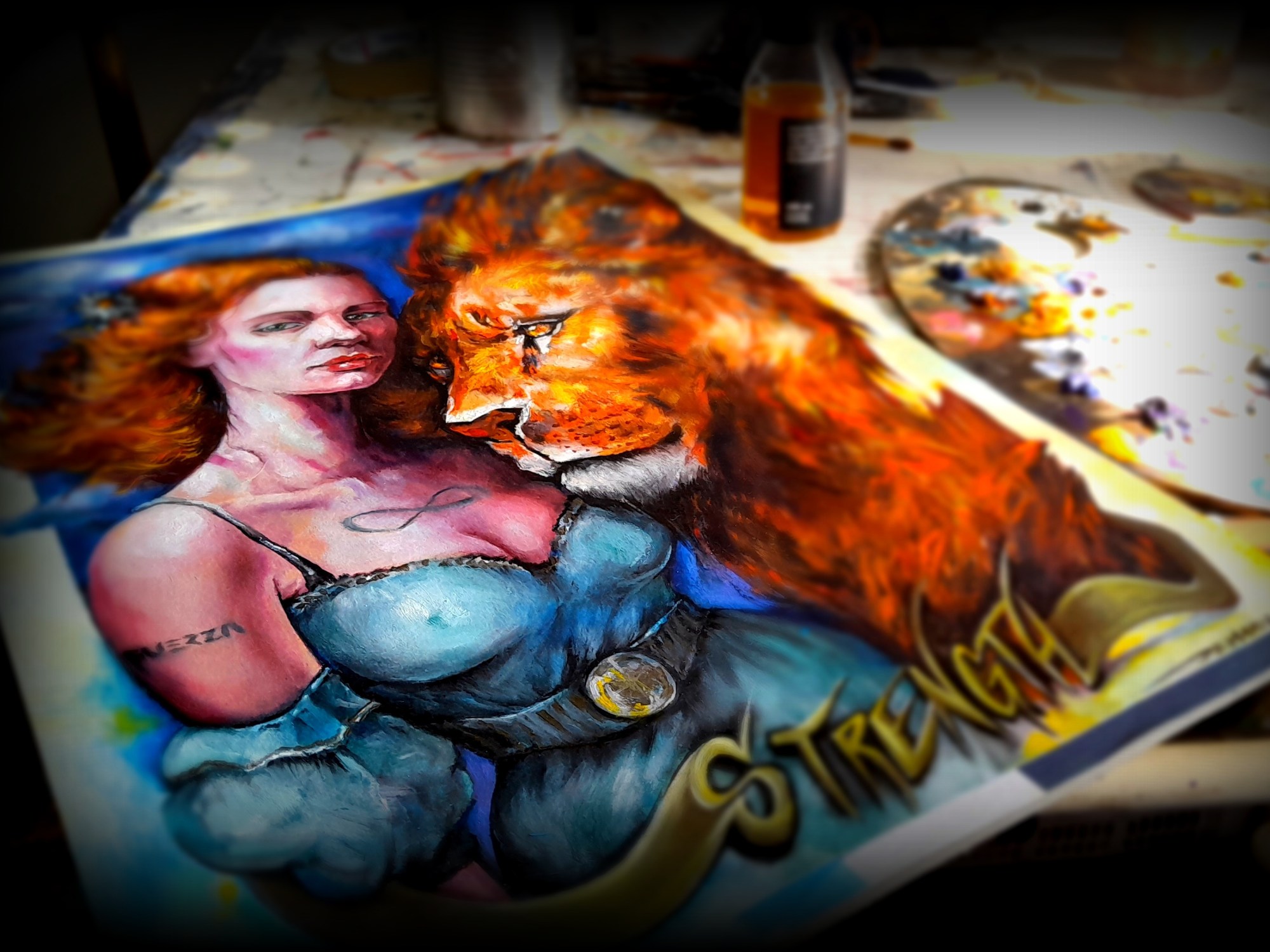 Nuevito; óleo sobre papel. “Fuerza” de la Serie de Tarot.